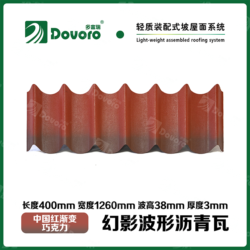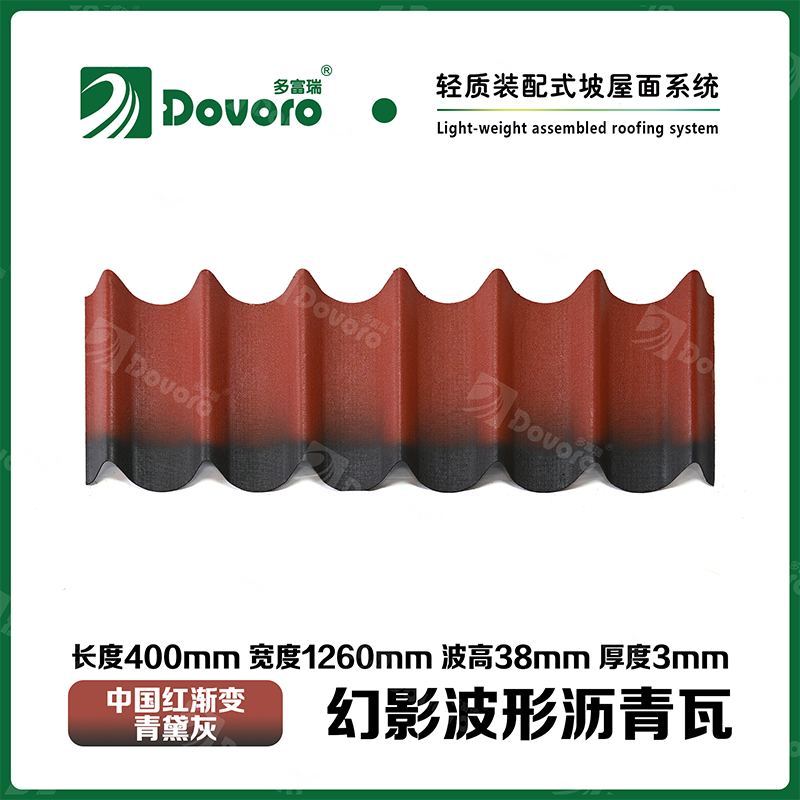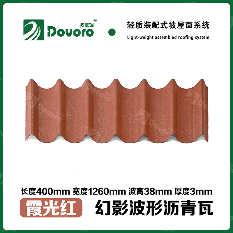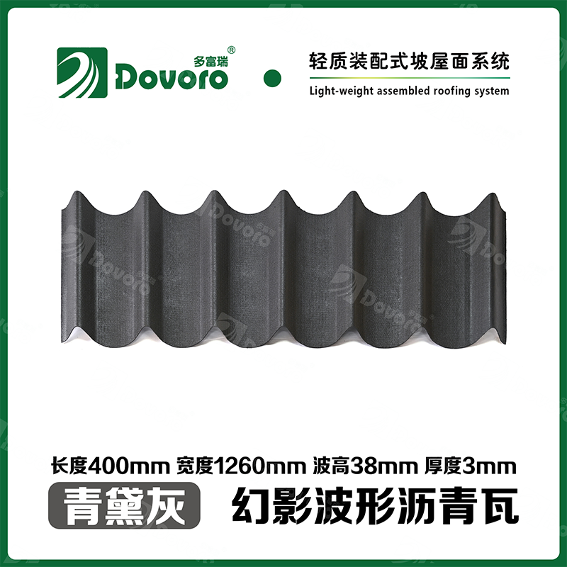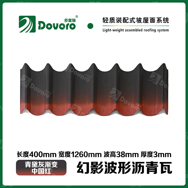 多富瑞幻影波形瀝青瓦是由礦植物纖維板經(jīng)過(guò)整形后浸漬瀝青而成,一次成型的基層板在高溫下浸漬瀝青,使瓦材整體性更加牢固;熱固性樹脂保證了瓦材的強(qiáng)度和剛度;進(jìn)口原料配合先進(jìn)的著色工藝確保顏色持久、混色噴涂工藝使瓦材外觀高雅、色彩美觀、立體質(zhì)感。