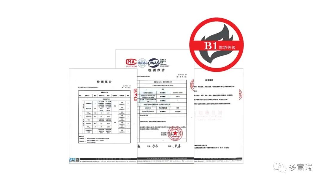 多富瑞產(chǎn)品符合最新的《建筑材料及制品燃燒性能分級》(GB8624-2012),B1級防火材料標(biāo)準(zhǔn)。
