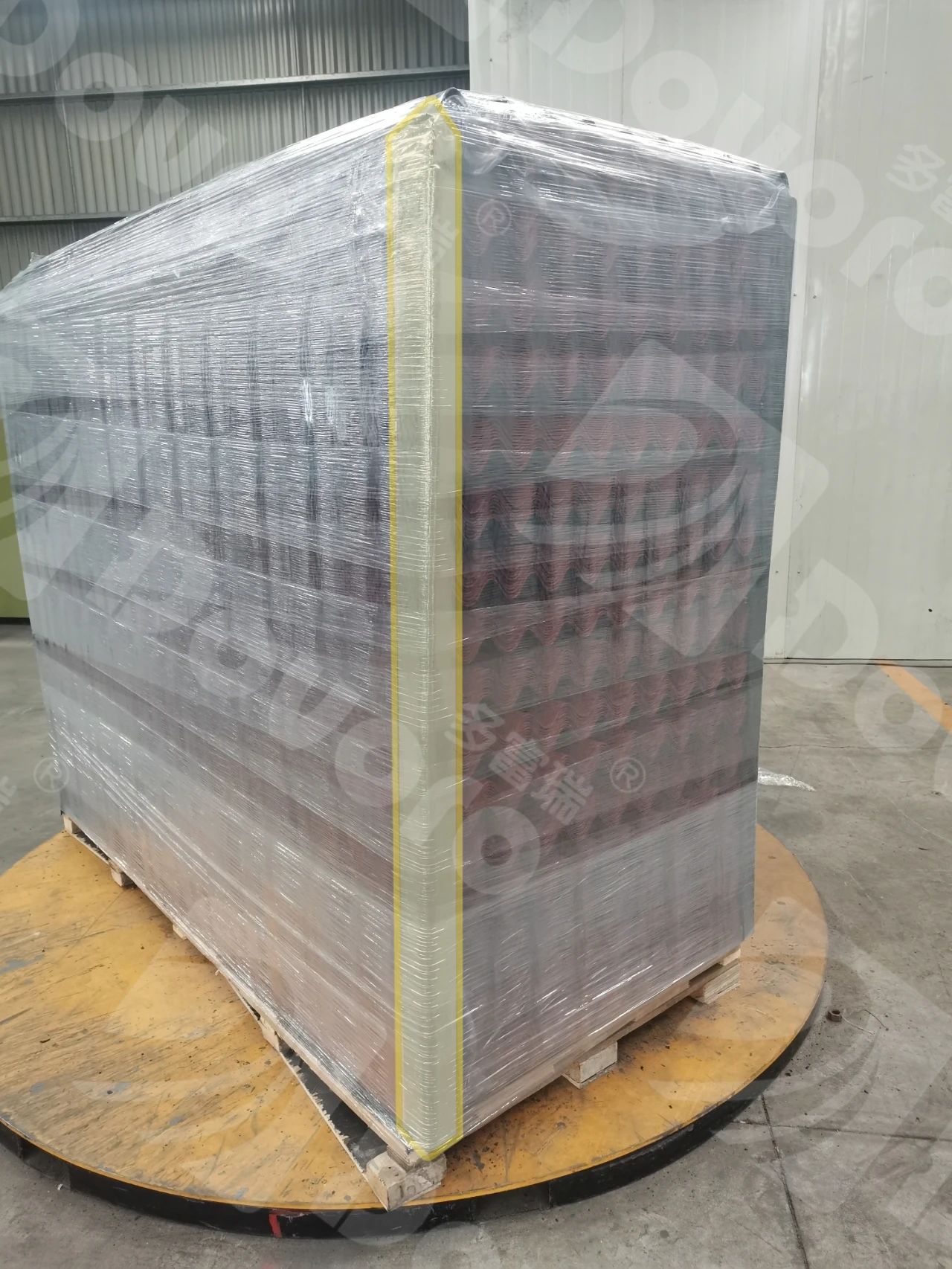 進行完以上流程后,貨物在包裝機上完成包裝的最后步驟。使用具有韌性的包裝膜,對貨物的整體進行纏繞,固定住四個角落的護邊和上方的蓋帽。不僅使貨物更整體更穩(wěn)固,也將貨物密封在包裝之中,與周圍不確定環(huán)境隔離。
