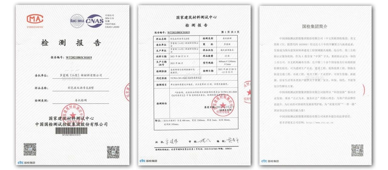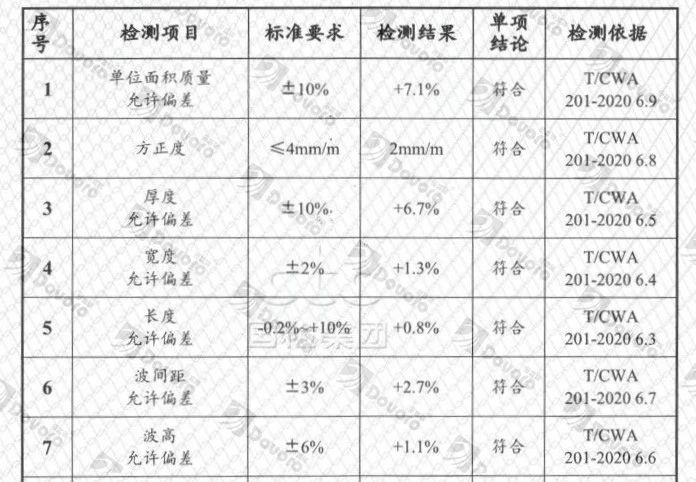 基礎尺寸檢測數(shù)值均在標準范圍內。基礎尺寸的穩(wěn)定可以保障施工的精度,瓦材在屋面上可以嚴絲合縫。得益于多富瑞對生產(chǎn)設備的不斷改進,自檢制度的優(yōu)化,多富瑞可以提供質量更加穩(wěn)定的產(chǎn)品。
