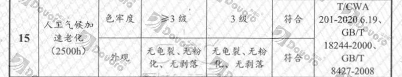 最后一項檢測是人工氣候加速老化測試,模擬不同的氣候條件,測試瓦材的外觀是否會有變化。經(jīng)過測試后色牢度為三級,外觀沒有發(fā)生油漆龜裂、粉化、剝落的情況。