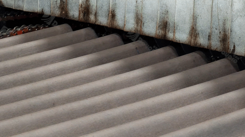 成型的波紋板會被掛到支架上,隨著傳送帶緩慢移動,進入瀝青池,這正是它蛻變成一塊合格的瓦材最重要的一步。